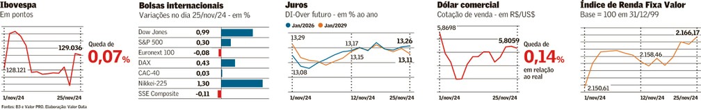 O dólar à vista, por sua vez, teve queda de 0,14%, cotado a R$ 5,8059, enquanto o Ibovespa fechou estável, com leve recuo de 0,07%, aos 129.036 pontos.