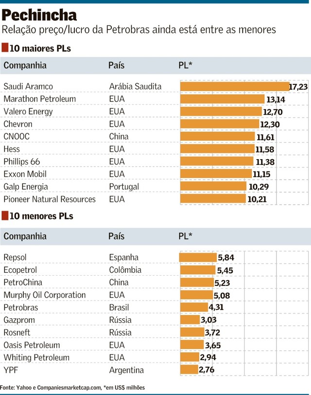 O indicador de preço/lucro (P/L) da Petrobras estava por volta de 4,3 vezes na quarta-feira, um dos menores entre as petroleiras. A Saudi Aramco, maior empresa do mundo em valor de mercado, tem um múltiplo de 17,2. Na americana Exxon, o P/L está em 11. Também estatal, a norueguesa Equinor tem um indicador de 7,2.