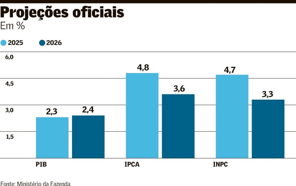 Além disso, a pasta revisou de 4,9% para 4,8% a estimativa da inflação oficial (IPCA) em 2025 – a projeção para 2026 se manteve em 3,6%. A meta é de 3%, com intervalo de tolerância de 1,5 ponto percentual para cima ou para baixo.