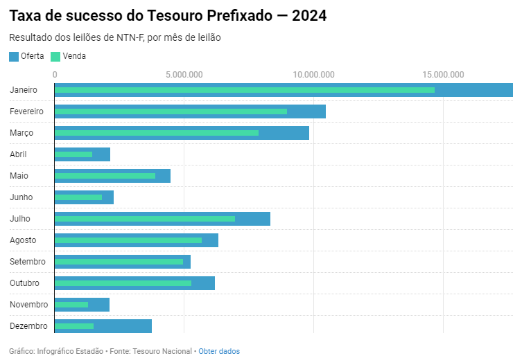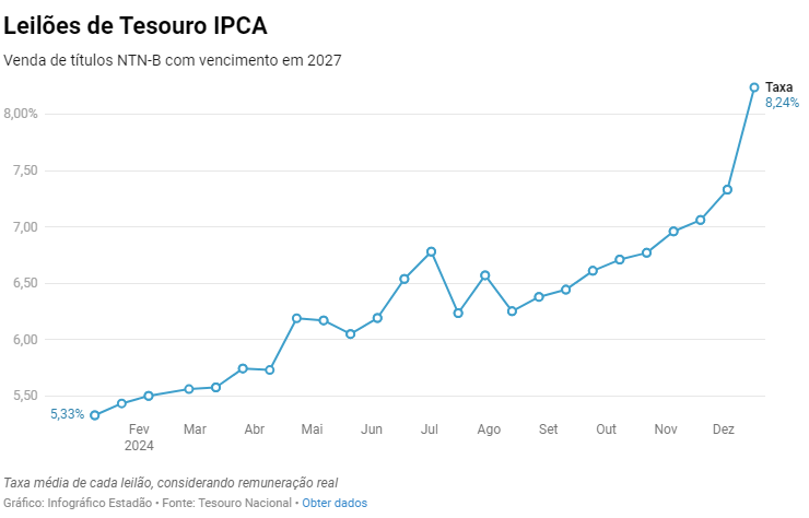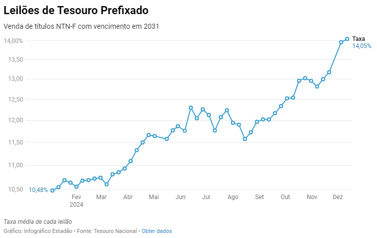 Situação parecida aconteceu com os títulos do Tesouro Prefixado (NTN-F) com vencimento em 2031, que pagam no vencimento juros predeterminados no ato da compra. Os papéis começaram o ano com uma taxa de 10,48% ao ano e terminaram com 14,05%, somado ao fato de o Tesouro não conseguir vender nada que ofertou nos últimos dois leilões do ano, mesmo propondo pagar os vencimentos mais cedo. A taxa de sucesso nos leilões caiu de 83% para 40% no período. Em 2025, os títulos prefixados já estão precificados acima de 15% ao ano.