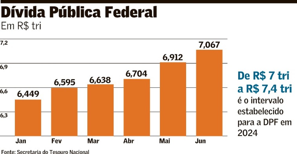 Outro destaque de junho foi o fato de a DPF ter ficado pela primeira vez em 2024 dentro dos limites do Plano Anual de Financiamento (PAF) da dívida. Esses limites vão de R$ 7 trilhões a R$ 7,4 trilhões, que é intervalo que o Tesouro espera que a dívida esteja até dezembro.