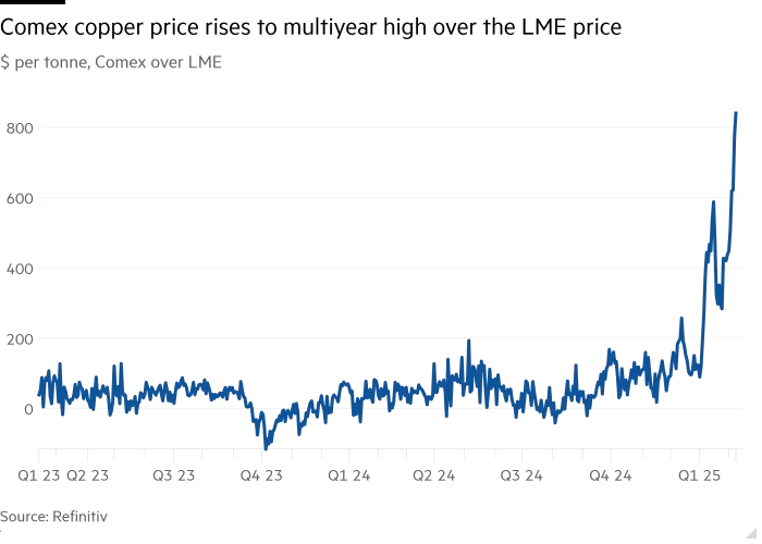 Investidores nos EUA estão pagando preços muito mais altos por cobre, alumínio e aço do que seus equivalentes na Europa, enquanto correm para adquirir os metais antes das tarifas anunciadas pelo presidente Donald Trump.