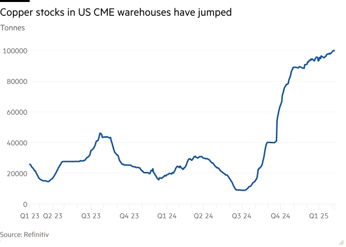 Os estoques de cobre da Comex saltaram no ano passado e tiveram um leve acréscimo neste ano. “As pessoas estão procurando se proteger contra a necessidade de pagar o preço do cobre acrescido da tarifa”, explicou William Adams, chefe de pesquisa de metais básicos na Fastmarkets.