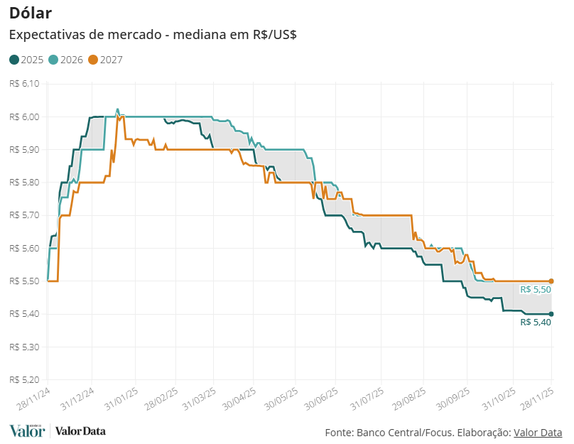A mediana das estimativas para o dólar no fim de 2025 se manteve em R$ 5,40. Para 2026, a mediana das expectativas para a moeda americana se manteve em R$ 5,50, mesmo valor estimado para 2027 e 2028.