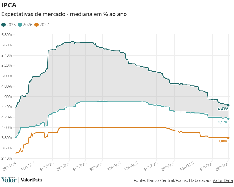 Para 2026, a mediana das expectativas para o Índice Nacional de Preços ao Consumidor Amplo (IPCA) caiu de 4,18% para 4,17%, para 2027, seguiu em 3,80% pela quarta semana seguida e, para 2028, continuou em 3,50%, também pela quarta semana seguida.