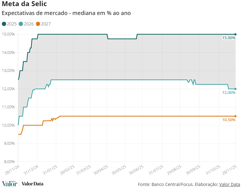 Para a taxa básica de juros (Selic), a mediana das estimativas manteve-se em 15% no fim de 2025, pela 23ª semana seguida; permaneceu em 12% no fim de 2026, seguiu em 10,50% em 2027 pela 42ª semana e, para 2028, caiu de 9,75% para 9,50%.