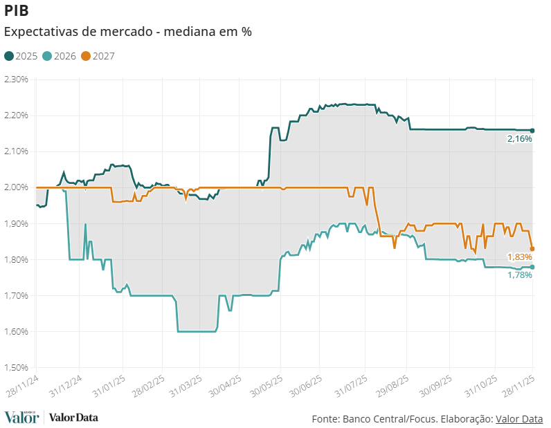 Para 2026, a mediana das expectativas para a expansão do Produto Interno Bruto (PIB) continuou em 1,78%, também pela quinta semana. Para 2027, caiu de 1,88% para 1,83% e, para 2028, seguiu em 2% pela 90ª semana seguida.