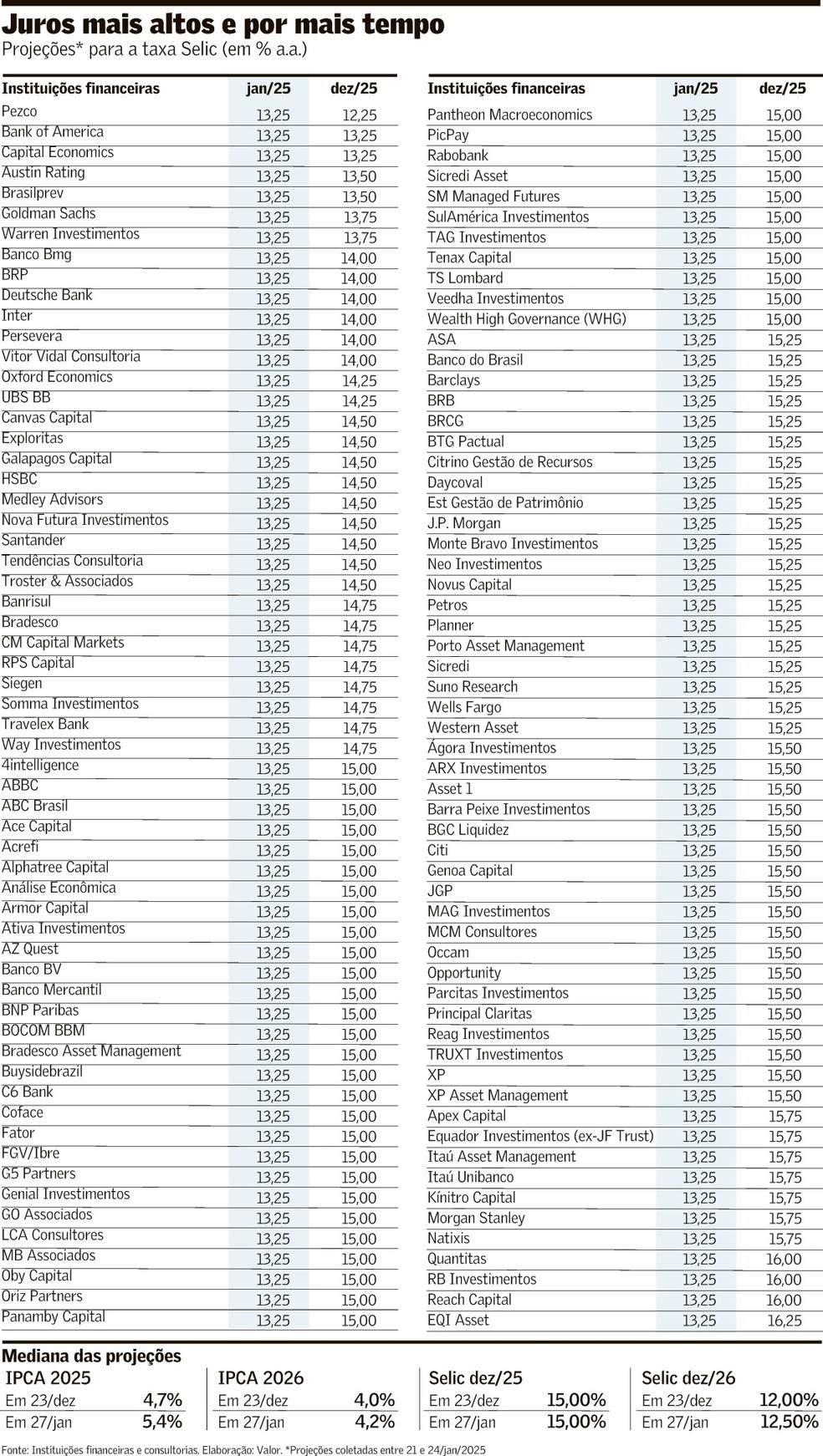 Em pesquisa realizada pelo Valor com 120 instituições, todas esperam que o Banco Central eleve a taxa básica de juros em 1 ponto percentual na reunião desta quarta-feira. Já a mediana das respostas para a taxa de juros no fim de 2025 está em 15%, ou seja, 0,75 ponto acima dos 14,25% já “contratados” pela orientação futura do Copom emitida em dezembro.