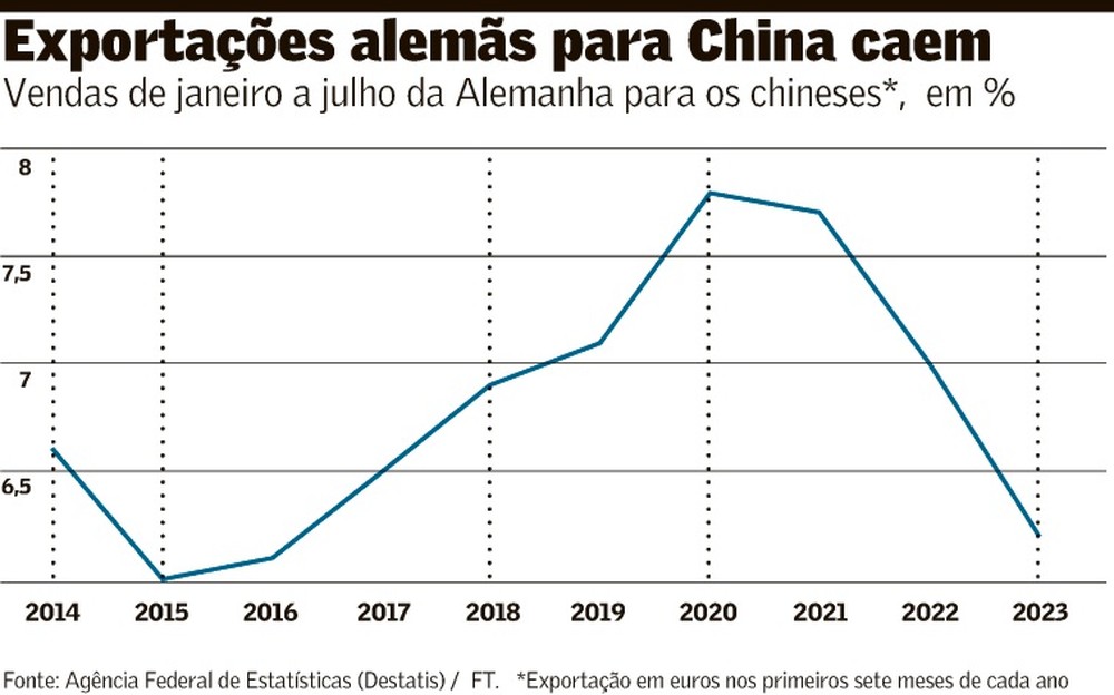 As remessas para seu segundo maior mercado de exportações, depois dos EUA, caíram 8,1% nos primeiros sete meses deste ano, quando comparadas ao mesmo período de 2022.