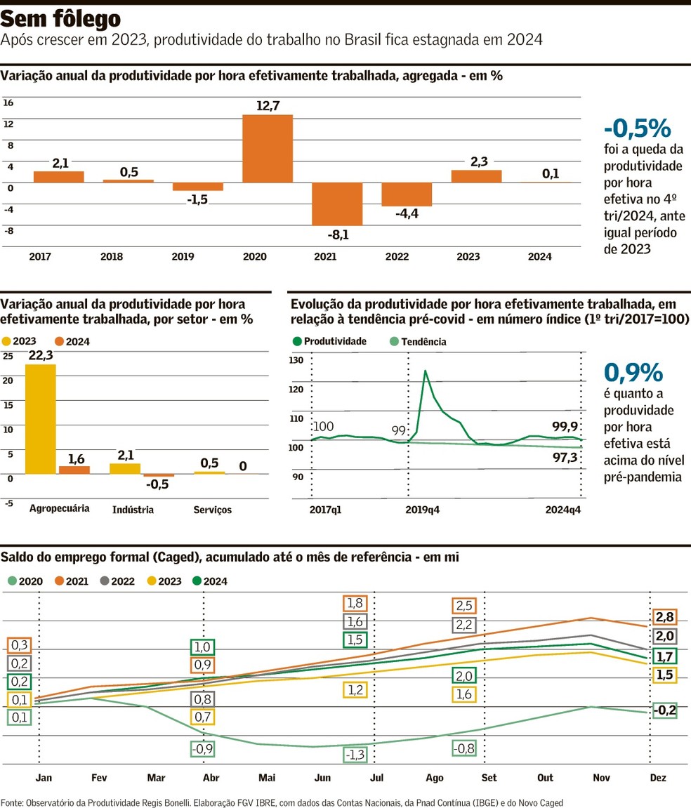 Desde 2021, a geração de emprego no Brasil tem sido, predominantemente, formal, observam os pesquisadores do FGV Ibre, o que traz um viés mais positivo para a produtividade, mas que ainda não apareceu. “E, na ponta, já parece haver uma desaceleração do emprego em 2025”, diz Peruchetti.
