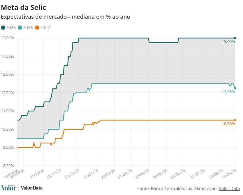 Para este ano, a mediana das previsões para a taxa básica de juros (Selic) seguiu inalterada em 15%, pela 13ª semana seguida; e também não mudou para 2027, ficando em 10,50% pela 32ª semana.