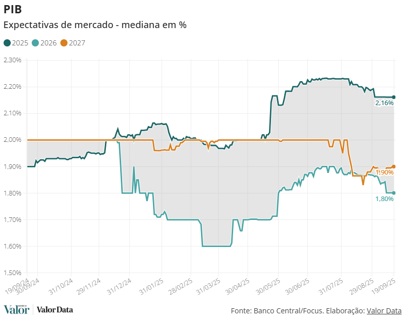 Para 2026, a mediana das expectativas para a expansão do Produto Interno Bruto (PIB) também ficou estável, em 1,80%, e, para 2027, se manteve em 1,90%.