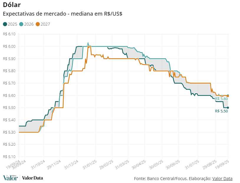 Para 2026, a mediana das expectativas para a moeda americana se manteve em R$ 5,60, mesmo valor previsto para 2027, com a mediana também inalterada em relação à semana anterior.