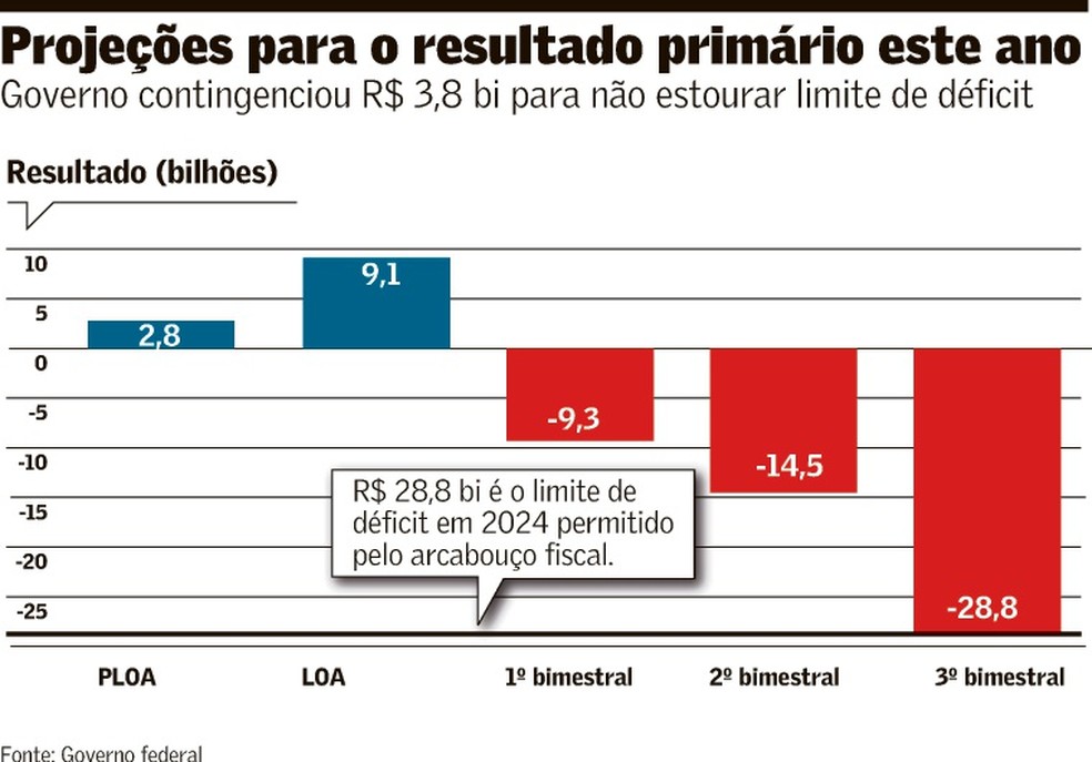 O déficit primário havia sido estimado em R$ 32,6 bilhões, após uma frustração nas receitas, em especial a ser obtida com o retorno do voto de qualidade do Conselho de Administração de Recursos Fiscais (Carf). Assim, o Executivo confirmou o contingenciamento de R$ 3,8 bilhões necessário para ficar dentro da banda de tolerância de resultado primário. O valor já havia sido anunciado na última semana pelo ministro da Fazenda, Fernando Haddad.