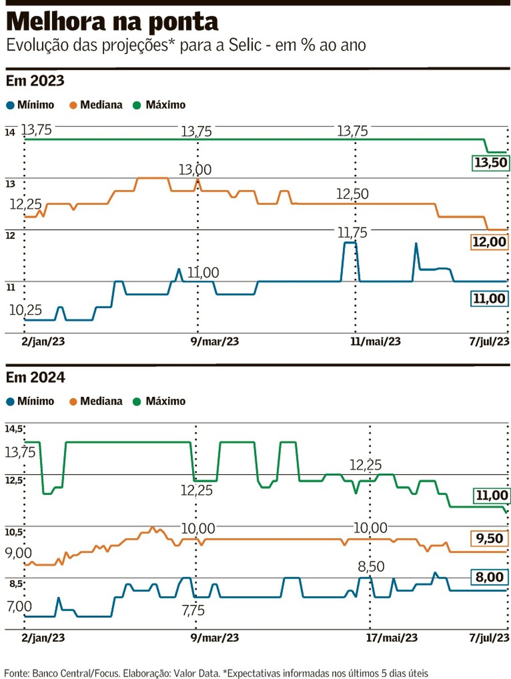 Segundo a mediana da última pesquisa Focus, do Banco Central, a projeção para a Selic no fim deste ano caiu a 12% e a 9,50% em 2024. Em relação ao nível máximo dessas estimativas, observado no fim de março, houve uma queda de, respectivamente, 0,75 ponto porcentual e 0,50 ponto.