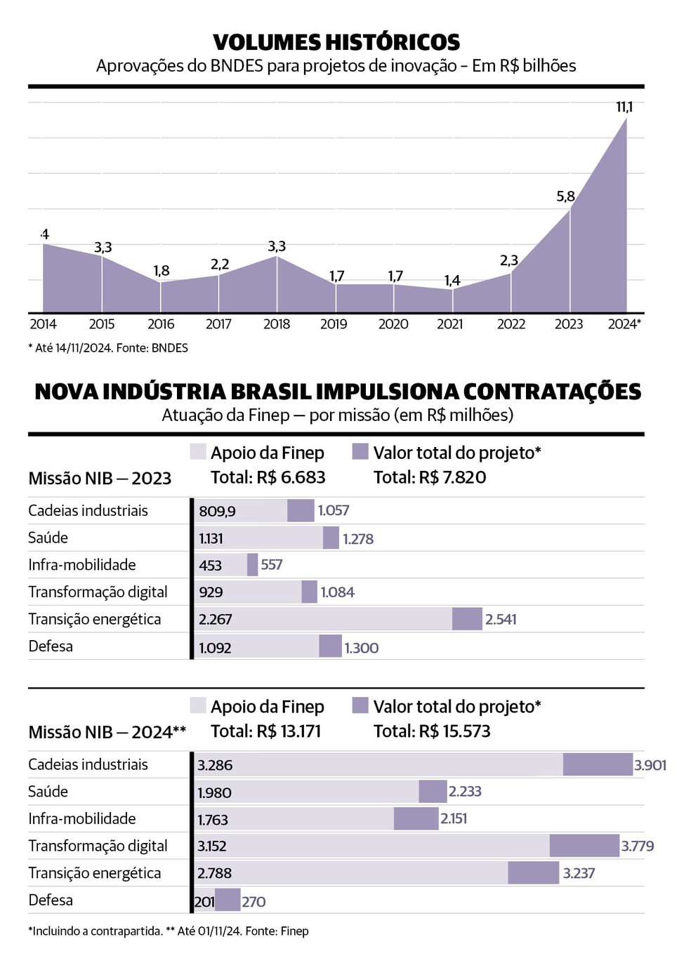 Escolhida como principal braço financeiro para projetos de inovação da NIB, segundo seu presidente, Celso Pansera, a Financiadora de Estudos e Projetos (Finep) contratou cerca de R$ 15,5 bilhões em 2024, nas seis missões consideradas prioritárias pelo Conselho Nacional de Desenvolvimento Industrial que norteiam o programa Finep Mais Inovação. Esse valor, que inclui contrapartidas aos R$ 13,17 bilhões da própria Finep, é 99% superior ao do ano passado (R$ 7,82 bilhões).