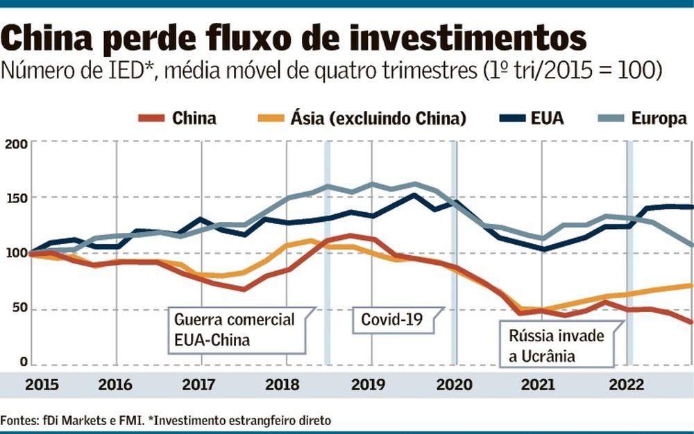 “O fluxo de IED estratégico para países asiáticos começou a cair em 2019 e se recuperou apenas moderadamente nos últimos trimestres, com exceção dos fluxos para a China que ainda não se recuperaram”, segundo os economistas do FMI (veja o gráfico acima).