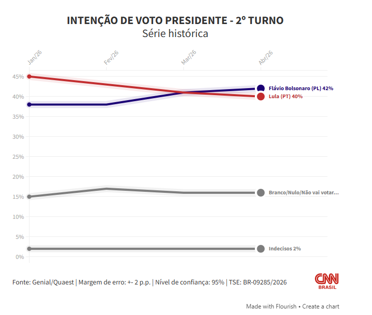 O resultado representa um empate dentro da margem de erro, de 2 pontos percentuais, para mais ou para menos. Na pesquisa anterior, divulgada em março, Flávio e Lula empatavam em 41% (veja detalhes no gráfico abaixo).