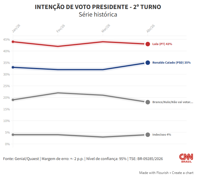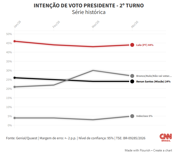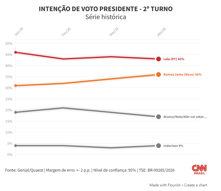 A pesquisa Genial/Quaest entrevistou 2.004 eleitores, entre os dias 9 e 13 de abril, por meio de entrevista presencial. A margem de erro do levantamento é de 2 pontos percentuais, para mais ou para menos, com intervalo de confiança de 95%.