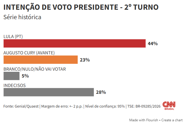 Por fim, um cenário com o psiquiatra Augusto Cury (Avante), Lula tem 44% e Cury, 23%.
