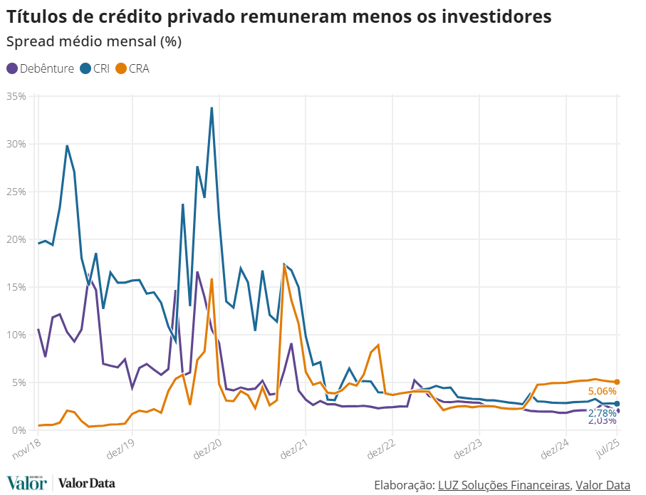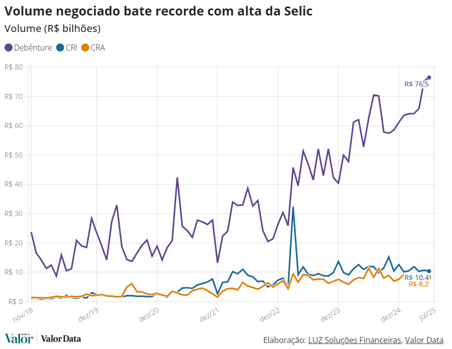 Olhando para o mercado de crédito privado como um todo, Amorim avalia que a queda da rentabilidade, combinada com o aumento expressivo no volume de negociações, especialmente no mercado secundário (onde ocorre a compra e venda direta entre investidores) de debêntures, sugere um ambiente de maior estabilidade e confiança.