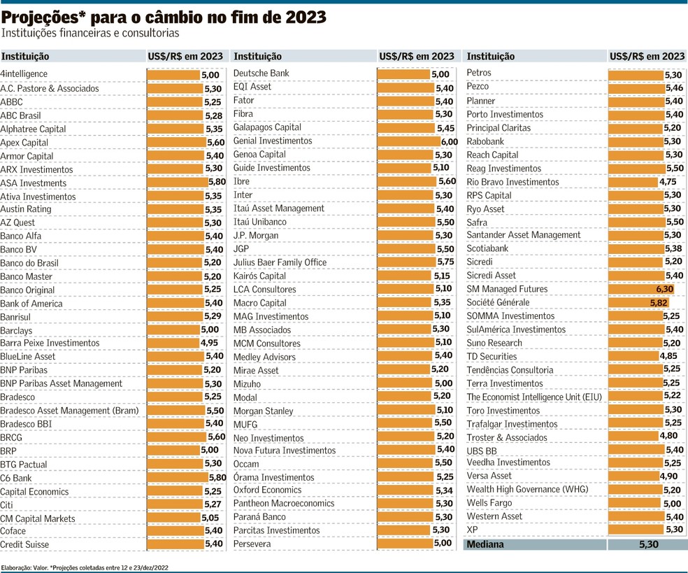 Em levantamento conduzido pelo Valor com 107 instituições financeiras e consultorias, a mediana das projeções para o nível do dólar no fim deste ano ficou em R$ 5,30 – ontem, fechou cotado a R$ 5,3518. Há, porém, uma amplitude relevante nas projeções, de R$ 1,55. Enquanto a casa mais otimista com o desempenho do real em 2023 espera que o dólar encerre o ano a R$ 4,75, a mais pessimista com a moeda brasileira acredita que a divisa americana fechará 2023 cotada a R$ 6,30.