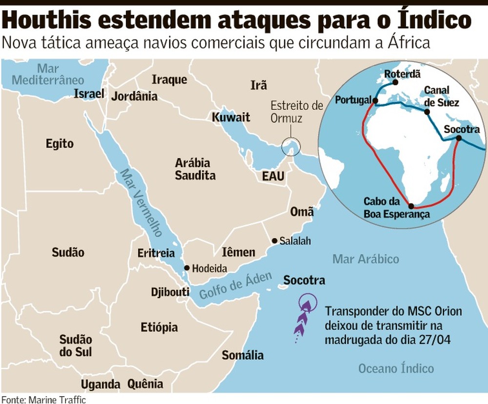 O ataque com drone ao MSC Orion na noite de 26 de abril se concretizou após ameaças dos rebeldes houthis, em março, de ampliar a área dos ataques para o Oceano Índico, mirando navios mercantes cumprindo rotas entre a Ásia e a Europa ou contornando o Cabo da Boa Esperança.