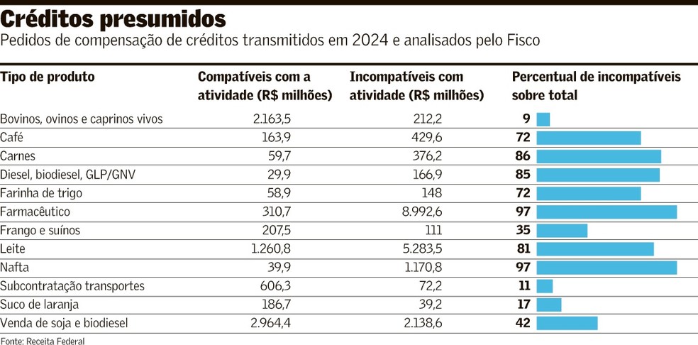 Depois, aparecem créditos relacionados à indústria de leite, em que R$ 5,3 bilhões dos pedidos de compensação foram indevidos, o equivalente a 81% do total de créditos na área transmitidos; venda de soja e biodiesel, com R$ 2,1 bilhões (42%); e nafta, com R$ 1,2 bilhão, 97% do total.
