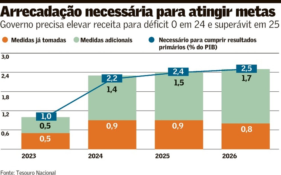 O Tesouro Nacional aponta que o governo precisa de um aumento permanente da arrecadação, por meio de fontes ainda não conhecidas, de até 1,7 ponto percentual do PIB até 2026 para conseguir cumprir as ambiciosas metas de resultado primário previstas no novo arcabouço fiscal.