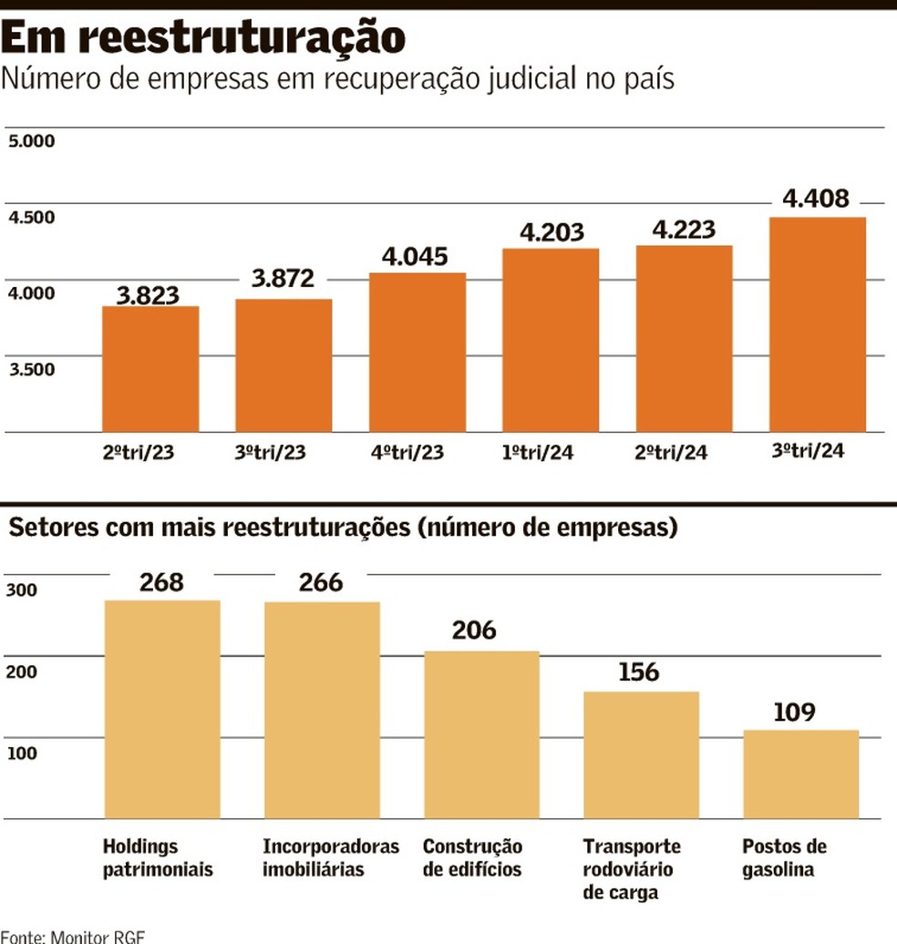 O número de empresas em recuperação judicial no Brasil voltou a subir de forma expressiva no terceiro trimestre, puxado por um forte movimento no Estado de Minas Gerais. No período, 433 companhias do país receberam autorização do Judiciário para negociar dívidas com credores, mais que o triplo do trimestre anterior (141), o que gerou mais um recorde. No fim de setembro, um total de 4.408 corporações estavam em processo de reestruturação, segundo dados do Monitor RGF de Recuperação Judicial, da consultoria RGF & Associados, compartilhados de forma exclusiva com o Valor.
