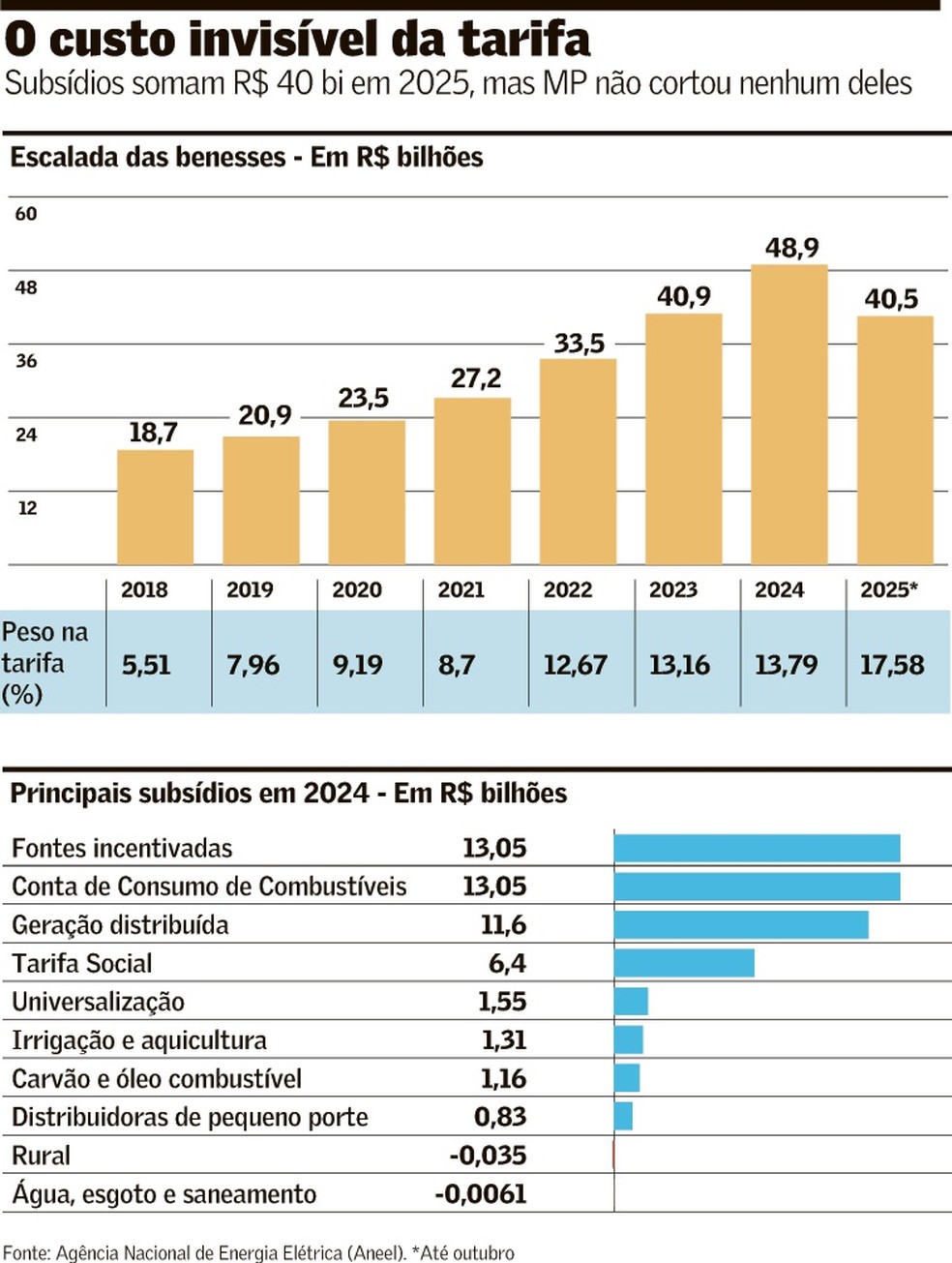 Dados da Aneel mostram que em 2025 o setor foi o que mais recebeu subsídios, somando quase R$ 13 bilhões. Em termos comparativos, a tarifa social, para consumidores de baixa renda, recebeu apenas R$ 4 bilhões.
