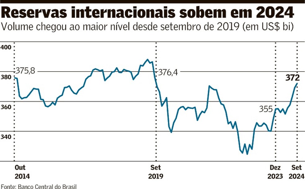 O nível das reservas internacionais atingiu o maior patamar em cinco anos, fechando setembro em US$ 372 bilhões, segundo o Banco Central (BC). Em dezembro do ano passado, esse valor era de US$ 355 bilhões. Especialistas atribuem o crescimento à valorização no preço dos títulos públicos americanos, que compõem boa parte das reservas brasileiras, e das receitas com juros.