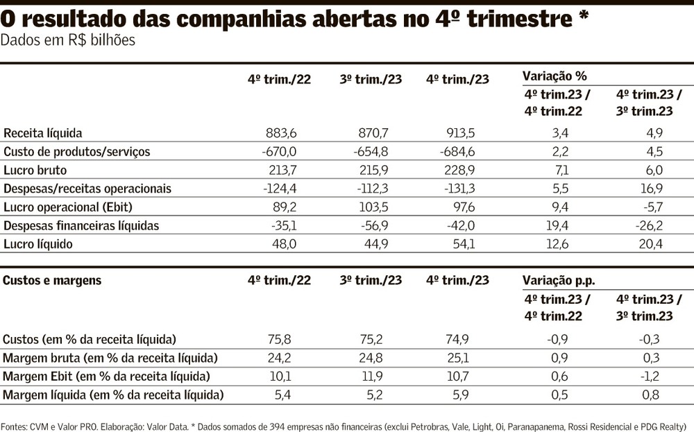 Levantamento do Valor Data com 394 empresas não financeiras mostra que o lucro líquido dessa amostra chegou a R$ 54,1 bilhões, alta de 12,6% na comparação anual e 20,4% sobre setembro. Já as receitas alcançaram R$ 913,5 bilhões entre outubro e dezembro, crescimento de 3,4% sobre o mesmo período de 2022 e de 4,9% ante o terceiro trimestre.