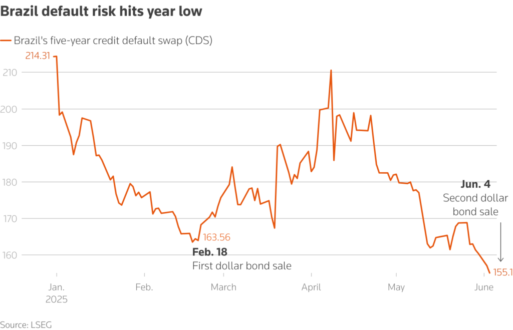 A operação ocorre em meio a uma recente queda no credit default swap (CDS) de cinco anos do Brasil — um indicador-chave do risco soberano usado por investidores para se protegerem contra inadimplência.