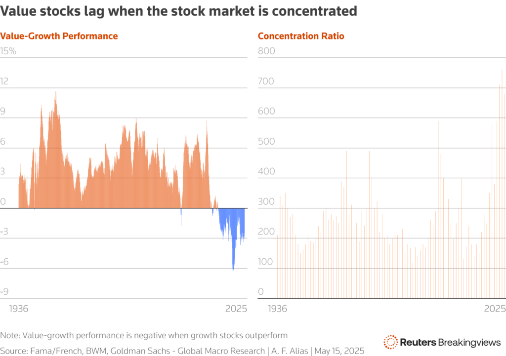 Os Estados Unidos abrigam as maiores e mais lucrativas empresas que o mundo já viu. Os retornos exorbitantes das Sete Magníficas ao longo da última década deprimiram os retornos relativos das ações de valor e das small caps. No final do ano passado, o mercado acionário dos EUA tornou-se mais concentrado do que em qualquer outro momento desde a década de 1930. Georg von Wyss, gestor de portfólio da empresa suíça BWM, observa que, no passado, períodos de concentração extrema do mercado foram acompanhados de desempenho inferior das ações de valor. Foi o que ocorreu durante o boom das “Nifty Fifty” no início da década de 1970 e novamente na bolha da tecnologia no final dos anos 1990.