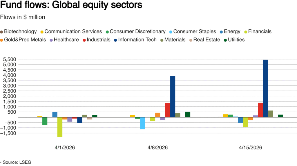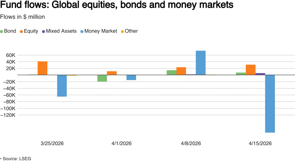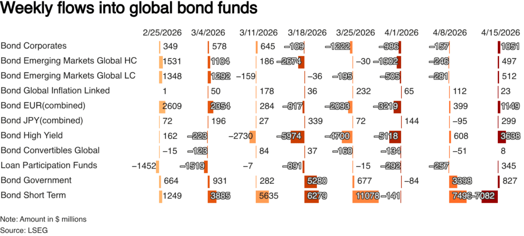 17 de abril (Reuters) – Os fundos globais de ações registraram uma quarta entrada semanal consecutiva na semana encerrada em 15 de abril, à medida que resultados corporativos fortes e o aumento do otimismo de que a guerra com o Irã poderá ser resolvida mais rapidamente do que o esperado impulsionaram o apetite por risco.