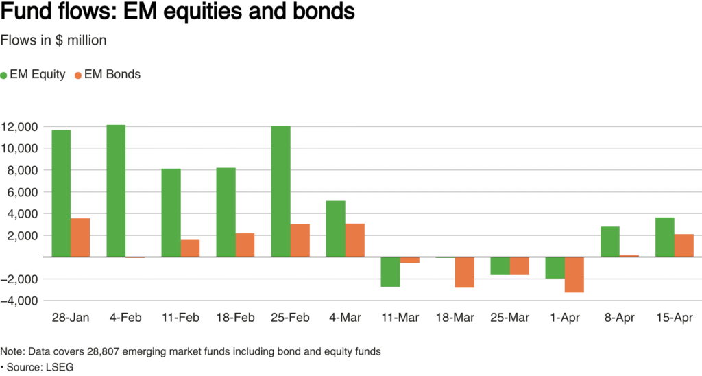 Os mercados emergentes registraram uma segunda semana consecutiva de investimentos líquidos, à medida que os investidores injetaram US$ 3,63 bilhões em fundos de ações e US$ 2,11 bilhões em fundos de títulos, mostraram dados de um universo combinado de 28.807 fundos.