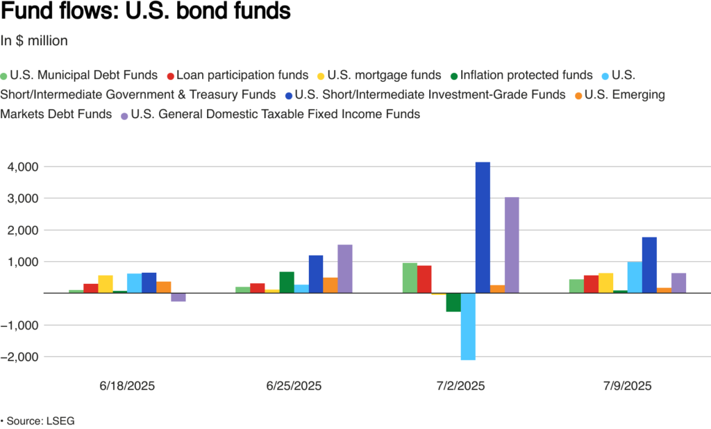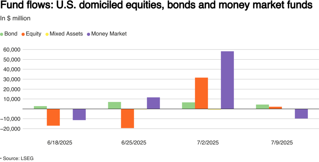 Os fundos de ações dos Estados Unidos registraram uma queda significativa nas aplicações líquidas na semana encerrada em 9 de julho, em meio à cautela dos investidores diante das novas ameaças tarifárias do presidente Donald Trump contra parceiros comerciais, apesar das ações terem atingido novas máximas impulsionadas pela crescente demanda no setor de inteligência artificial.