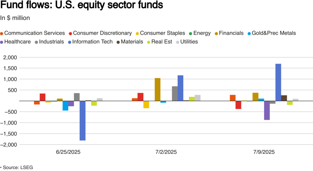 Os fundos setoriais registraram compras líquidas pela segunda semana consecutiva, com aproximadamente US$ 1,28 bilhão direcionados a esses veículos. O setor de tecnologia recebeu US$ 1,7 bilhão, enquanto o setor de saúde teve saídas líquidas de US$ 874 milhões.