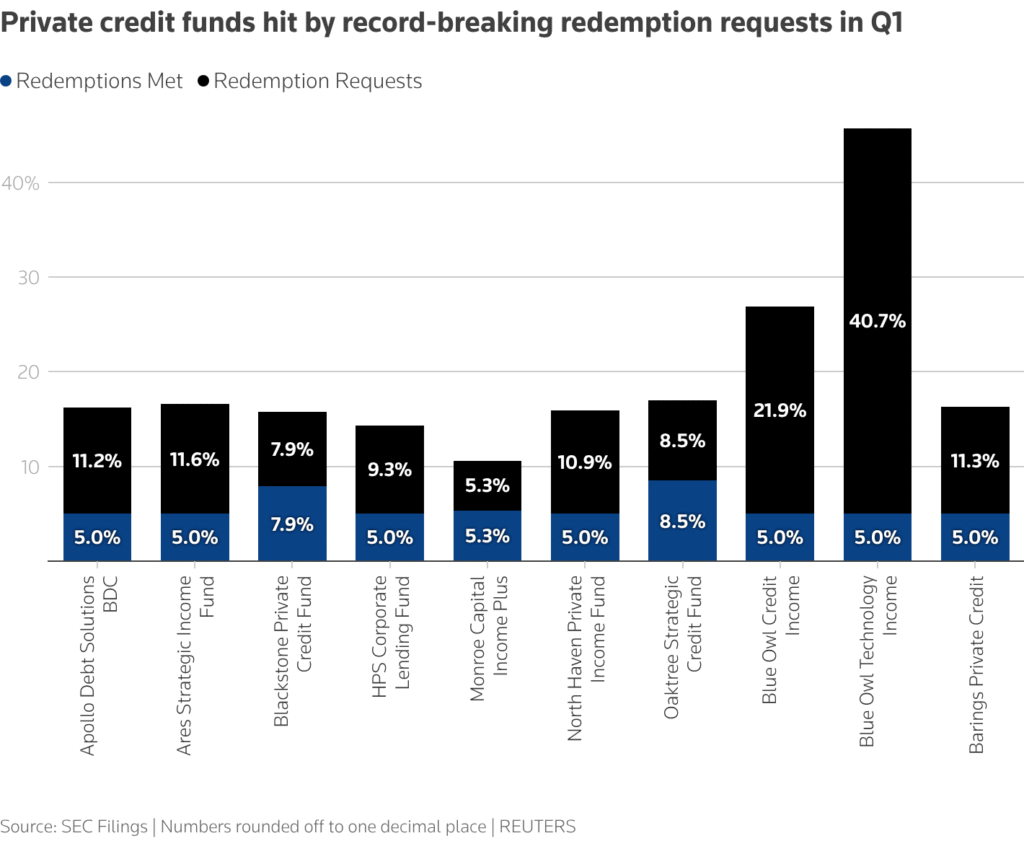 A gestora de crédito privado Blue Owl disse na semana passada que limitaria os resgates em dois de seus fundos a 5% das ações, após receber um nível histórico de pedidos de resgate no primeiro trimestre.