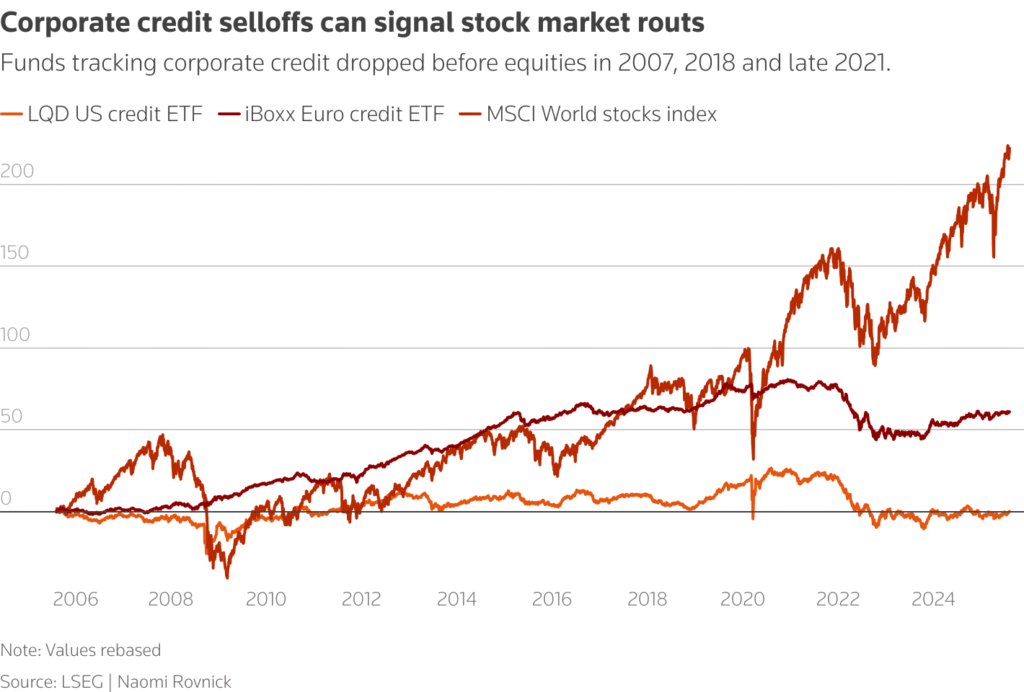 Antes da queda provocada pela guerra comercial entre EUA e China em 2018, da forte correção causada pela alta de juros em 2022 e de um movimento semelhante no fim de 2023, um fundo de índice (ETF) popular que acompanha crédito corporativo de alta qualidade caiu algum tempo antes das ações globais (.MIWD00000PUS).