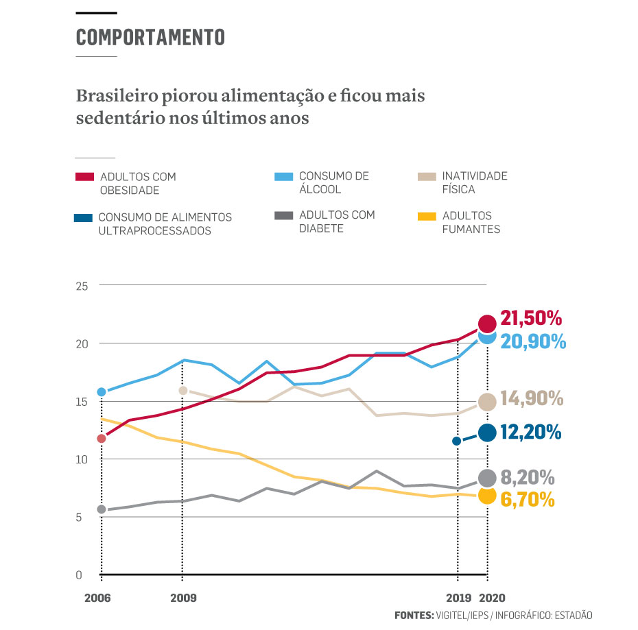 Conforme dados do levantamento Vigilância de Fatores de Risco e Proteção para Doenças Crônicas por Inquérito Telefônico (Vigitel),feitopelo Ministério da Saúde, a proporção de adultos obesos no Brasil chegou a 21,5% em 2020. Essa taxa era de 11,8% em 2006. A pesquisa também revela que houve aumento no consumo de álcool, de ultraprocessados e também no sedentarismo.