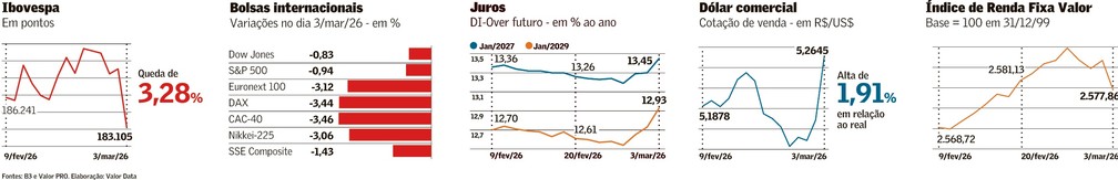A reação tímida do mercado ao início da guerra entre Estados Unidos e Irã se transformou rapidamente em um movimento coordenado de ampla aversão a risco na sessão de ontem. Com temores crescentes de que o conflito se estenda mais do que os investidores esperavam, as bolsas globais exibiram forte queda, o dólar se fortaleceu amplamente frente a divisas desenvolvidas e emergentes e a alta nos preços do petróleo ampliou os receios de que bancos centrais não sejam capazes de afrouxar mais os juros ao redor do mundo. No Brasil, o Ibovespa caiu mais de 3%, o dólar fechou o dia aos R$ 5,26 e os investidores passaram a precificar um ritmo mais brando de cortes na Selic pelo Banco Central.
