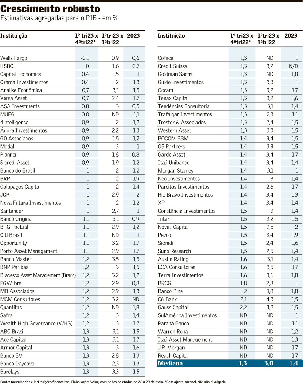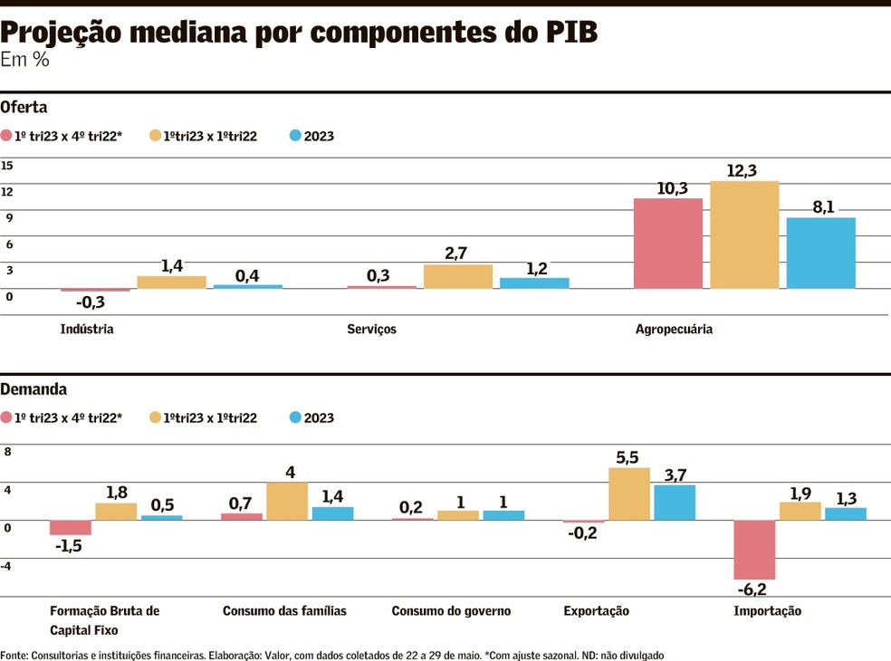 A alta prevista para o PIB no primeiro trimestre deste ano, ante o quarto trimestre de 2022, deve ser de 1,3%, de acordo com a mediana das projeções de 72 instituições financeiras e consultorias ouvidas pelo Valor. Nos três últimos meses do ano passado, o PIB recuou 0,2%, na mesma base de comparação.