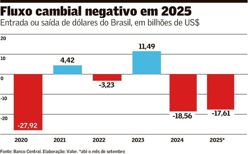 E, nesse sentido, o quadro não é dos melhores: dados do Banco Central mostram que, antes mesmo de entrar no último trimestre do ano, que costuma ser o pior período para o fluxo cambial, a saída de dólares do Brasil em 2025, de janeiro a setembro, registra 95% de todo o montante que deixou o país nos 12 meses de 2024. Nesse período, o fluxo cambial ficou negativo em mais de US$ 17 bilhões.