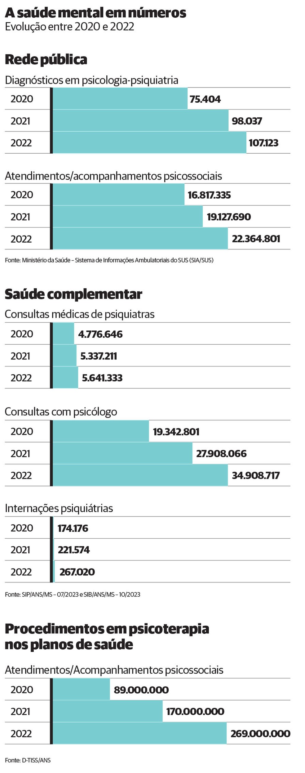 O evento que pôs o tema definitivamente na ordem do dia foi a pandemia de covid-19, em 2020 e 2021. Nesses anos de isolamento social, marcados pelo medo e pela solidão, a busca por atendimento psicológico e psiquiátrico se expandiu com força. Entre beneficiários de planos de saúde, as despesas com procedimentos de psicoterapia, que até 2019 giravam em torno de R$ 180 milhões por ano, chegaram a R$ 269 milhões em 2022, segundo estudo do Instituto de Estudos da Saúde Suplementar (IESS), baseado na Pesquisa Nacional de Saúde (PNS). O Sistema de Informações Ambulatoriais do SUS (SIA/SUS) também apontou salto de atendimentos em psicologia e psiquiatria na rede pública: de 55 milhões em 2020 para 62 milhões dois anos mais tarde.