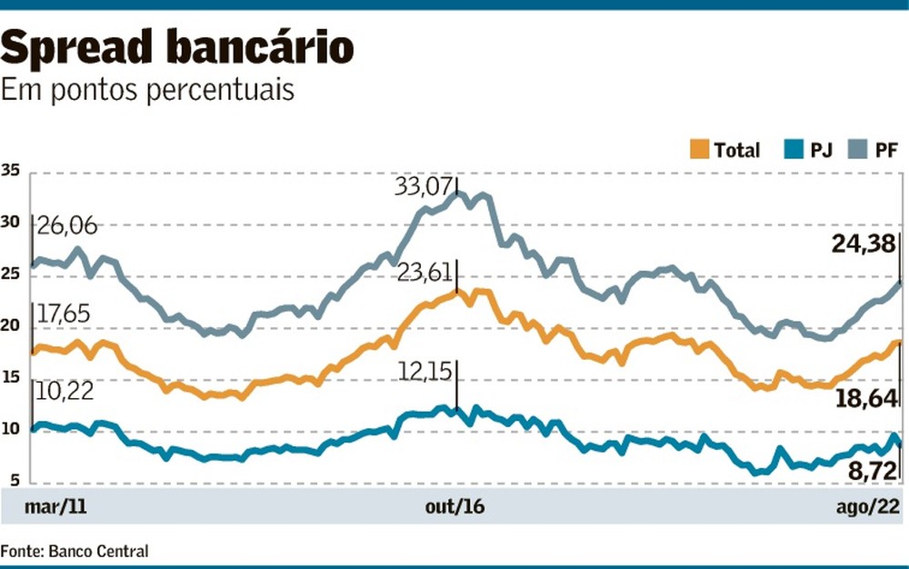 A alta teve início em meados do ano passado, depois de uma sequência de quedas que levou o spread a 14,43 pontos, o menor nível em mais de oito anos. A atual trajetória de elevações foi puxada principalmente pelo spread cobrado das pessoas físicas, que alcançou 24,38 pontos, maior patamar também em quase três anos.