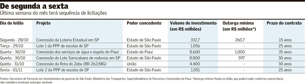 A última semana de outubro vai concentrar uma sequência de leilões de concessões, com licitações na B3Cotação de B3 de segunda a sexta-feira. Entre projetos de escolas, rodovias, saneamento e loteria, estão agendadas seis concorrências, com potencial de contratar R$ 24,2 bilhões de investimentos.