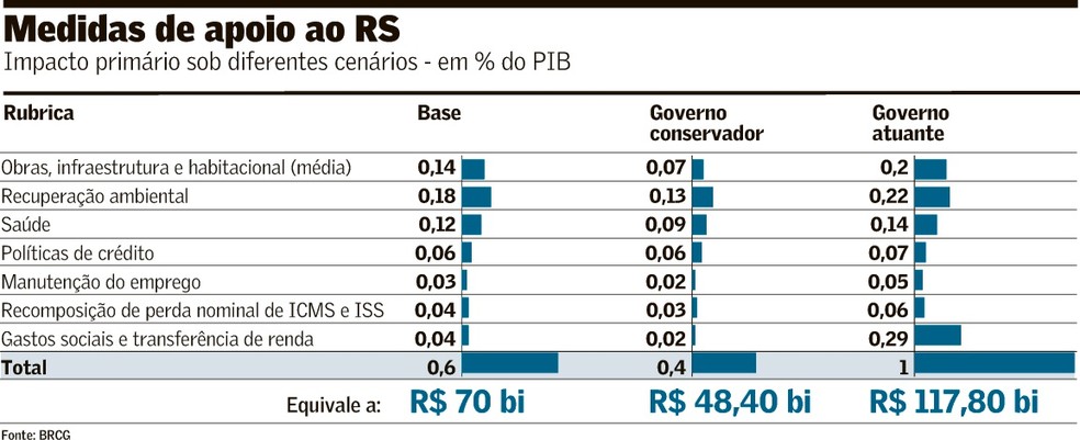 Ser pró-ativo significa, segundo a consultoria, ser mais atuante que em emergências anteriores, como nos deslizamentos na região serrana do Rio, em 2011. Caso o governo federal siga o padrão de outras tragédias, o gasto primário será de cerca de R$ 70 bilhões, o equivalente a 0,6% do PIB, no cenário-base de relatório antecipado ao Valor.