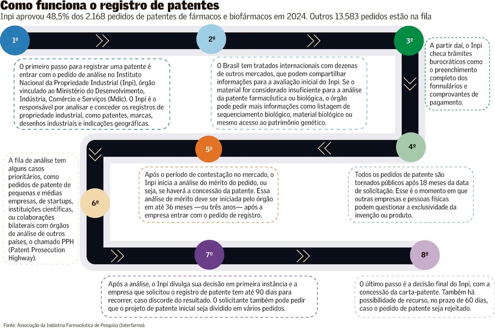A dinamarquesa Novo Nordisk, que na última semana levou para o Superior Tribunal de Justiça (STJ) o embate para prorrogar a patente da semaglutida, afirma que são realizados investimentos robustos para desenvolvimento de novas moléculas, sem a garantia de que resultarão em medicamentos. “É a proteção de patentes que permite a geração de novos medicamentos, que por sua vez são a base para a produção posterior de biossimilares e genéricos”, afirmou a companhia ao Valor em fevereiro. Já um levantamento da Associação Brasileira da Indústria de Química Fina (Abifina), divulgado no fim de junho, aponta que mais de mil medicamentos perderão suas patentes no mercado brasileiro nos próximos cinco anos, movimentando um mercado bilionário.